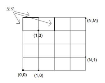 첫째 줄에 도로의 가로 크기 N과 세로 크기 M이 주어진다. N과 M은 100보다 작거나 같은 자연수이고, 둘째 줄에는 공사중인 도로의 개수 K가 주어진다. K는 0보다 크거나 같고, 100보다 작거나 같은