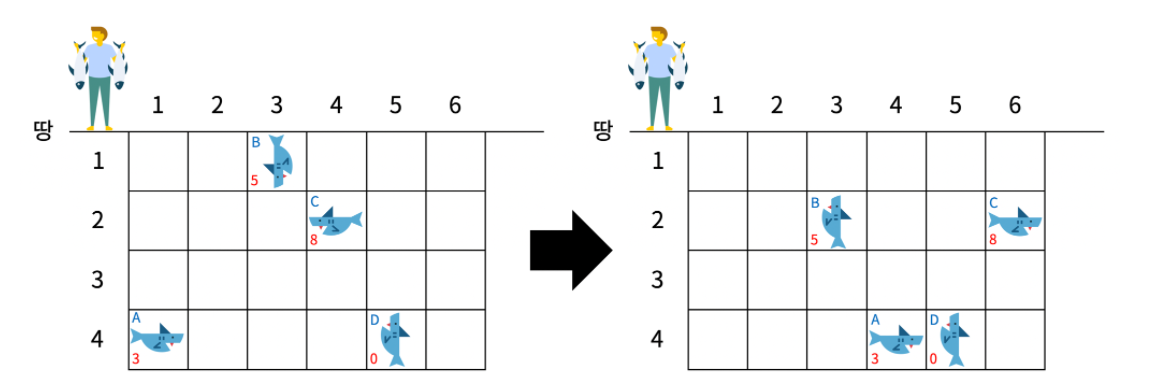 2. 낚시왕은 가로 너비만큼 반복문을 돌려줘서 해당 열에 있는 상어중 가장 가까운 상어를 잡도록 했습니다.