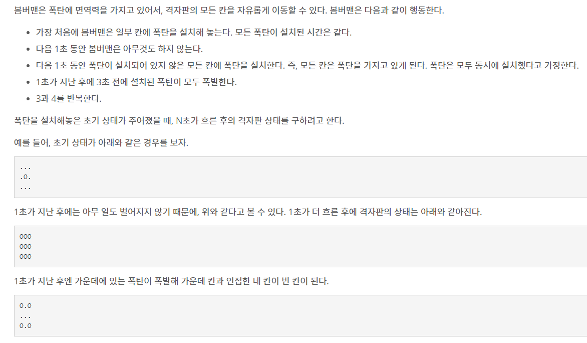 처음엔 나머지 연산을 해서 폭탄위치 마킹 -> 빈곳에 폭탄 채우기 -> 폭탄위치가 마킹된곳 BFS로 폭발시키기 이런식으로 구현했는데 주기별로 위의 상태가 변화하는것이 아니라서 문제에서 요구하는것을 그대로 구현하도록 했습니다.