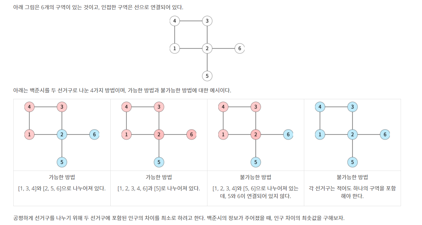 선거구를 [1, 4], [2, 3, 5, 6]으로 나누면 각 선거구의 인구는 9, 8이 된다. 인구 차이는 1이고, 이 값보다 더 작은 값으로 선거구를 나눌 수는 없다.