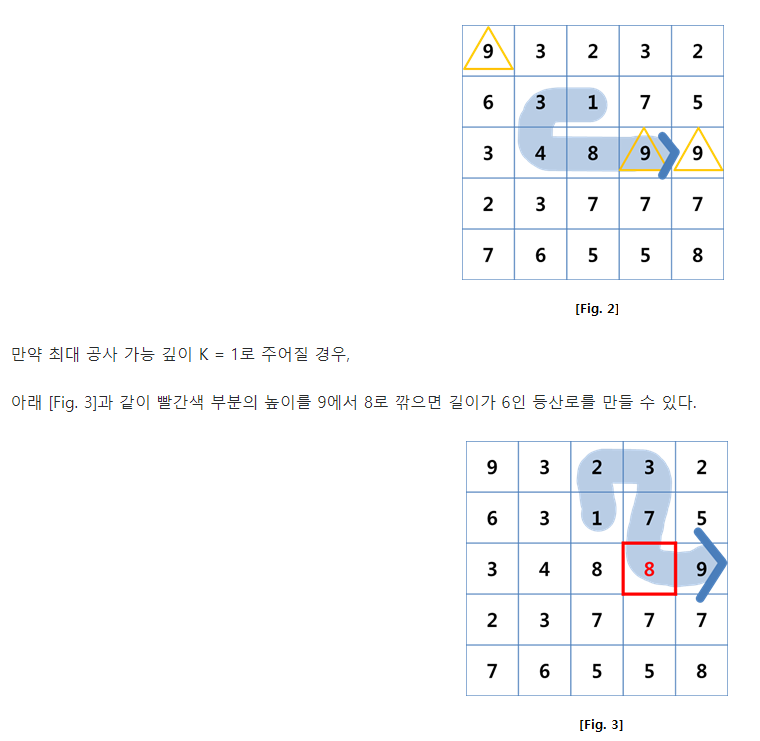 등산로를 만들때 현재위치보다 다음위치가 더 낮아야 등산로를 만들 수 있습니다. 이때 최장 등산로를 만들기 위해서 최대 K 값만큼 봉우리를 깎을 수 있지만 단 한번만 깎을 수 있습니다.