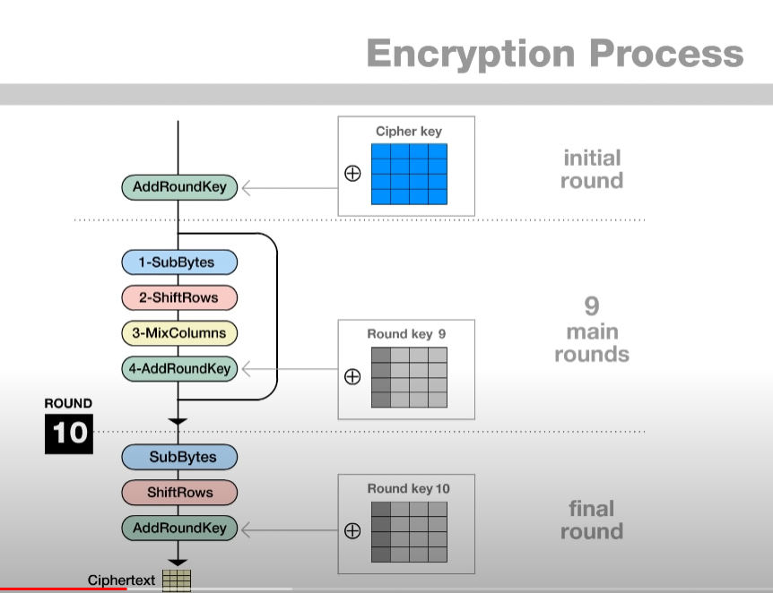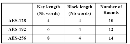 - 암호화 Key로 128, 192, 256bit 를 가질 수 있다. 암호화 Key 의 길이에 따라 실행하는 Round의 수가 다르다.
