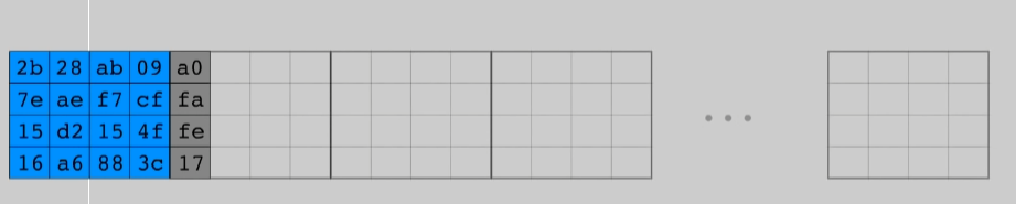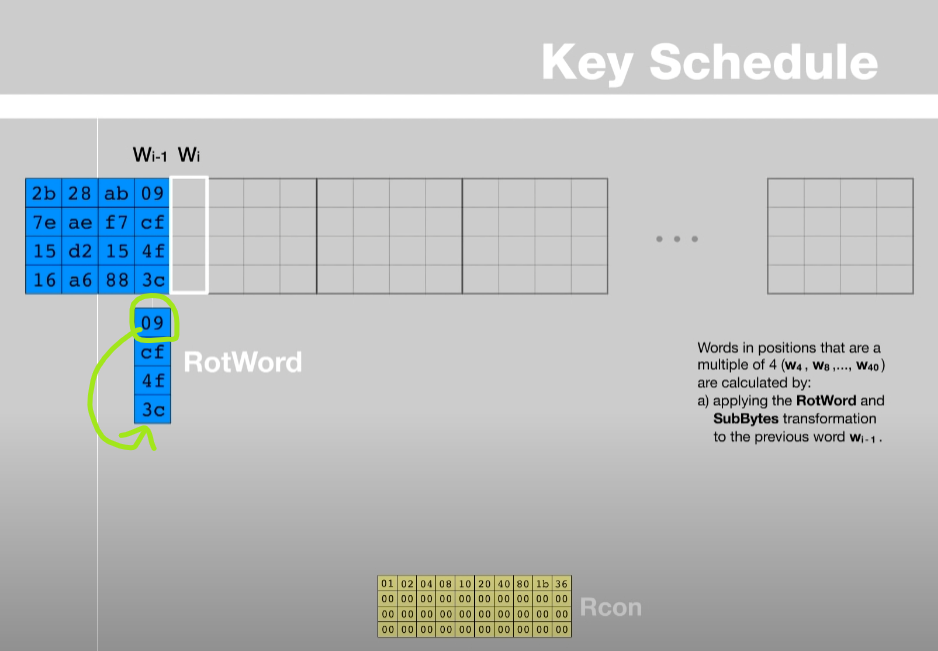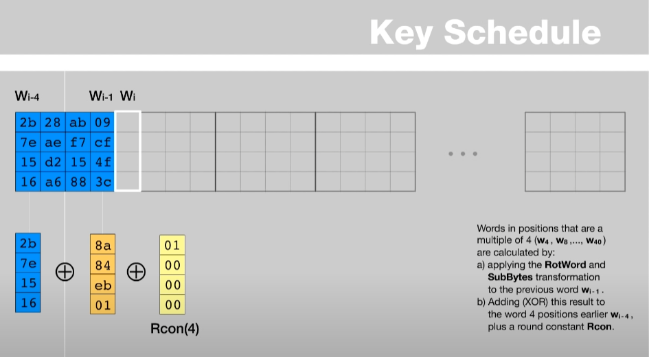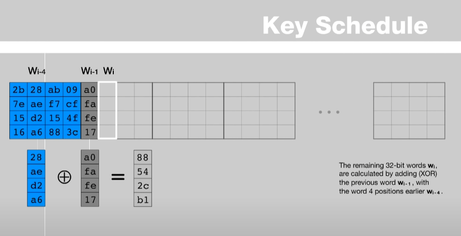 - 현재 만들려고 하는 Key의 위치가 Wi이라고 하면, Wi-4번째 열과 위에서 계산한 값과 XOR 연산을 한다. 이 결과와 다시 Rcon의 열과 XOR 연산을 수행한다.
