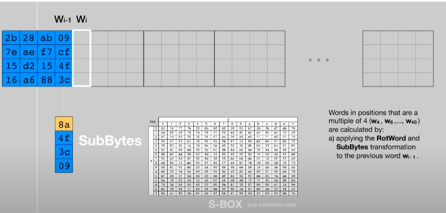 - 4개의 워드 중 마지막 워드는 1byte 왼쪽 rotate 이동된 후 S-box 를 이용하여 치환한다.