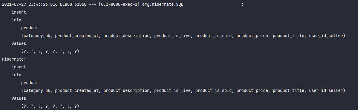 @DynamicInsert 는 insert를 할때 null인 필드를 제외시켜주는 역할을 하기 때문에 Product에 default로 잡혀있는 값으로 insert가 되는것을 확인 할 수 있습니다.