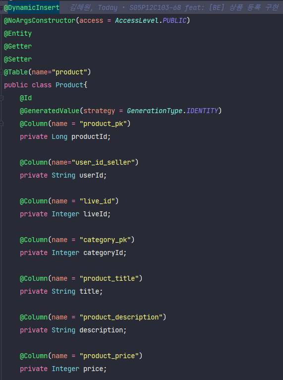 @DynamicInsert 는 insert를 할때 null인 필드를 제외시켜주는 역할을 하기 때문에 Product에 default로 잡혀있는 값으로 insert가 되는것을 확인 할 수 있습니다.