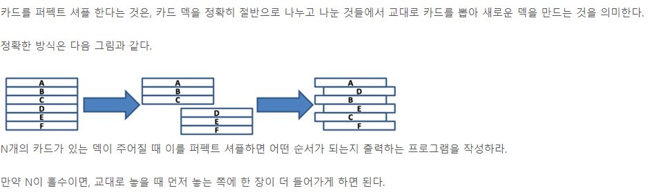 N개의 카드가있으면 이를 정확하게 반으로 나누고 나눈것들을 교대로 카드를 뽑아 새로운 덱을 만드는 문제이다. 이때 반으로 나눈 카드들을 각각 맨 앞에 있는 카드를 먼저 뽑아야 한다. 맨 앞에 있는 카드를 먼저 뽑아야 하는 순서를 지켜야 하기 때문에 Queue 를 활용하여 풀었다.