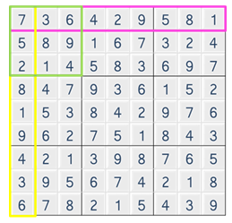 스도쿠 게임을 할 때 가로방향 합, 세로방향 합, 내부 영역의 합이 모두 45일때가 올바른 스도쿠 입니다.