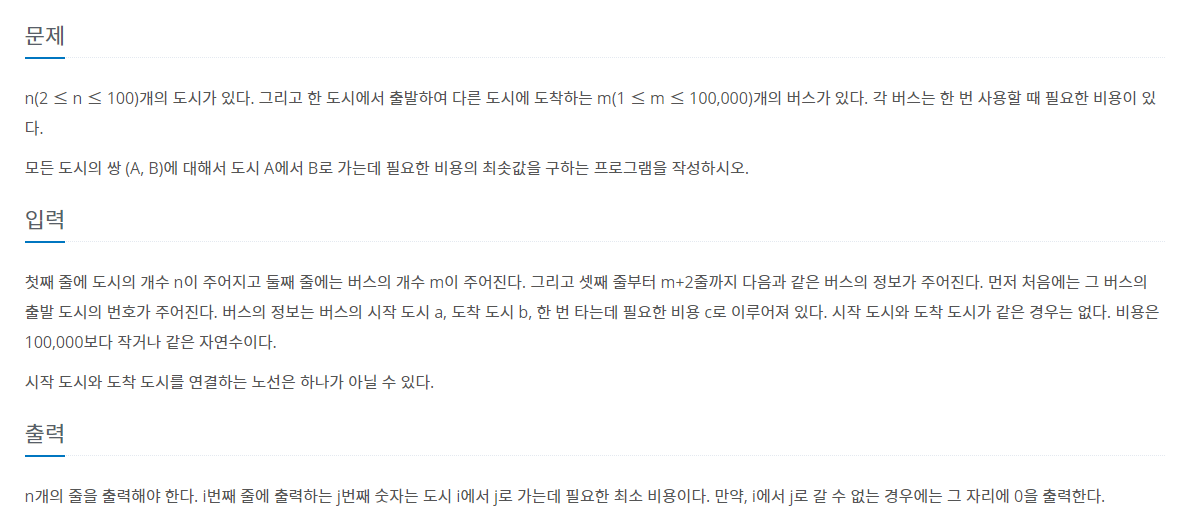 - 하나의 정점에서 다른 정점으로 바로 갈 수 있으면 비용을 업데이트 시켜줍니다. 이때 갈수있는 경로가 여러개라면 최소값을 저장합니다.