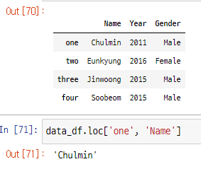 - DataFrame객체에서 [] 연산자내에 한개의 컬럼을 리스트로 입력하면 한개의 컬럼으로 구성된 DataFrame 반환