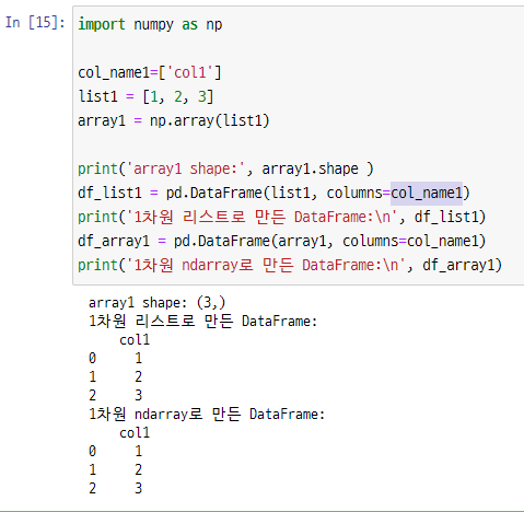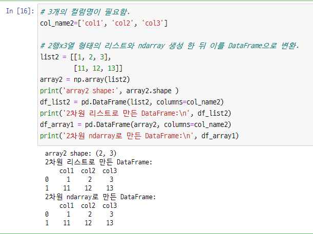 - ndarray를 DataFrame으로 변환 : ndarray와 매핑되는 컬럼명들을 입력. pd.DataFrame(array, columns=col_name1)