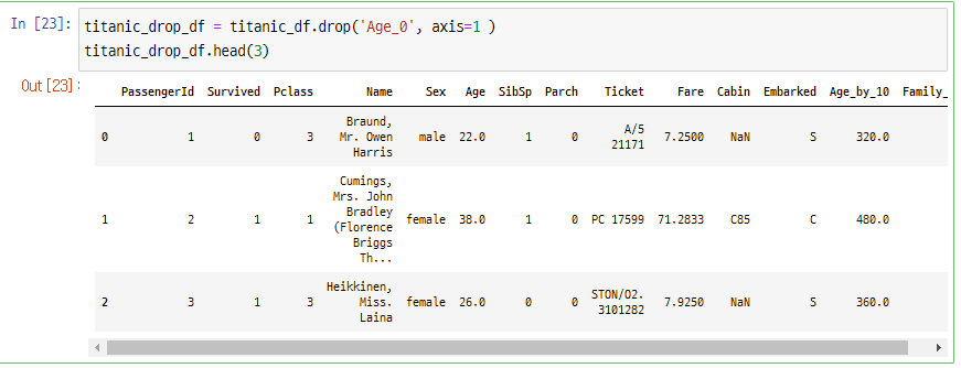 - axis : 행 삭제할때는 axis=0, 컬럼 삭제할때는 axis=1