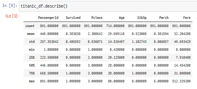 데이터값들의 평균,표준편차,4분위 분포도를 제공합니다. 숫자형 컬럼들에 대해서 해당 정보를 제공합니다.
