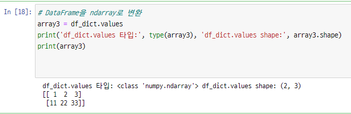 - DataFrame을 ndarray로 변환 : DataFrame객체의 values 속성을 이용하여 ndarray로 변환 (자주 사용된다!)