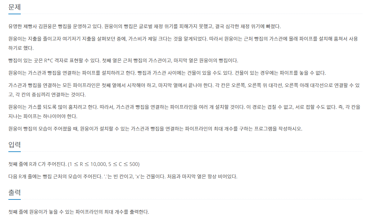 가스관을 연결할때 오른쪽, 오른쪽 위 대각선, 오른쪽 아래 대각선으로 연결할수있고, 각 칸의 중심끼리 연결합니다. 문제에서 요구하는것이 가장 가스관의 최소 최대 거리가 아니기 때문에 가스관이 갈수있는 경우를 되돌아가서 다시 탐색하지 않는것이 핵심입니다.