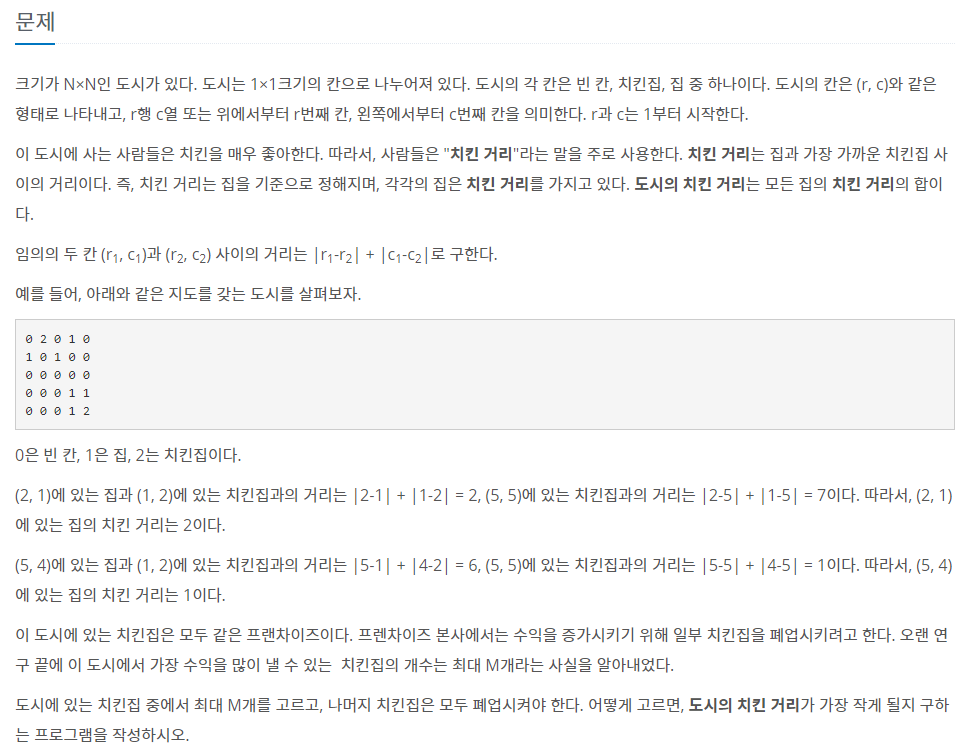 - M개의 치킨집을 모두 고르면 각각의 집을 기준으로 모든 치킨집과의 최소 치킨 거리를 구합니다.