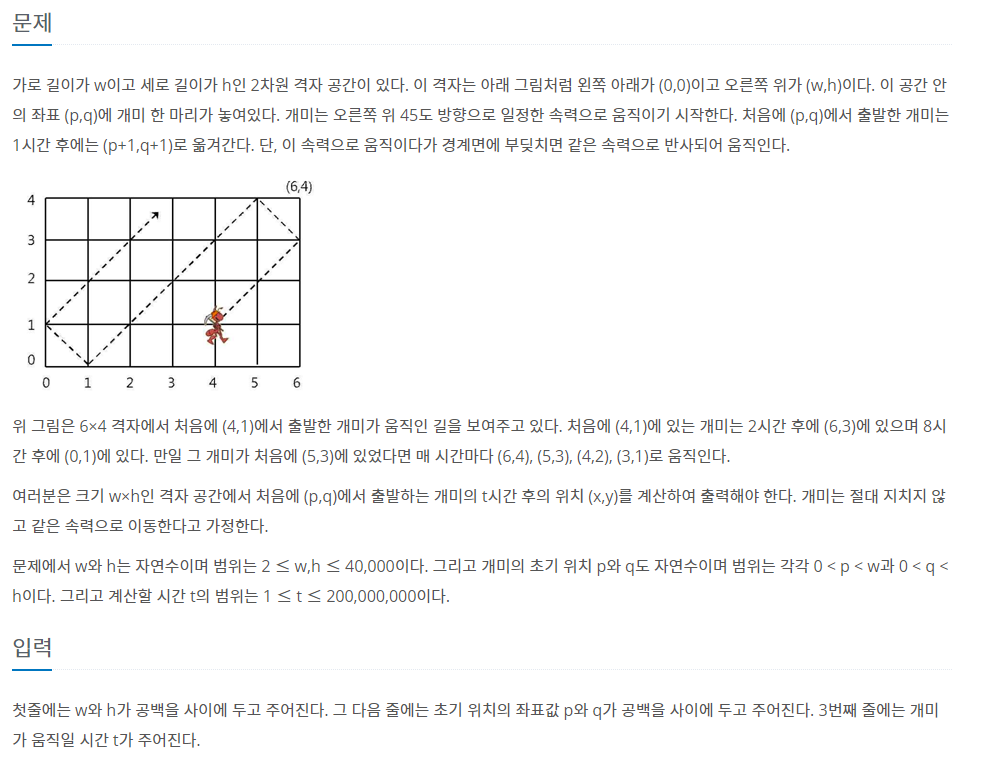 위의 블로그를 보고 x좌표와 y좌표를 나눠서 생각한다음, 개미가 총 이동한 좌표에서 너비를 나눠주면 개미가 몇번 왕복운동했는지가 나옵니다. 여기서 나눈값이 홀수이면 이미 끝을 찍고 되돌아오는중이기 때문에 x=0인 쪽으로 다가오는 방향입니다. 반대로 짝수이면 x=w인 쪽으로 가고있는중입니다.