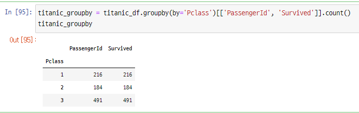 - titanic_df[['Pclass','PassengerId', 'Survived']].groupby('Pclass').count() 명령어도 동일한 결과를 보장합니다.