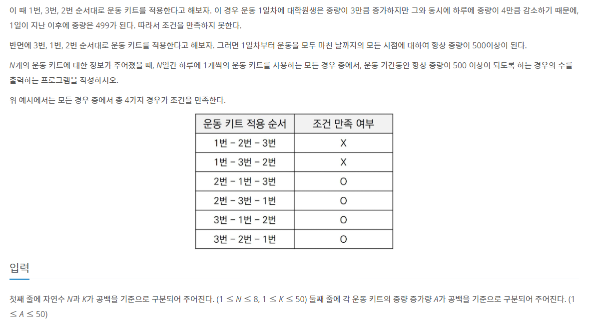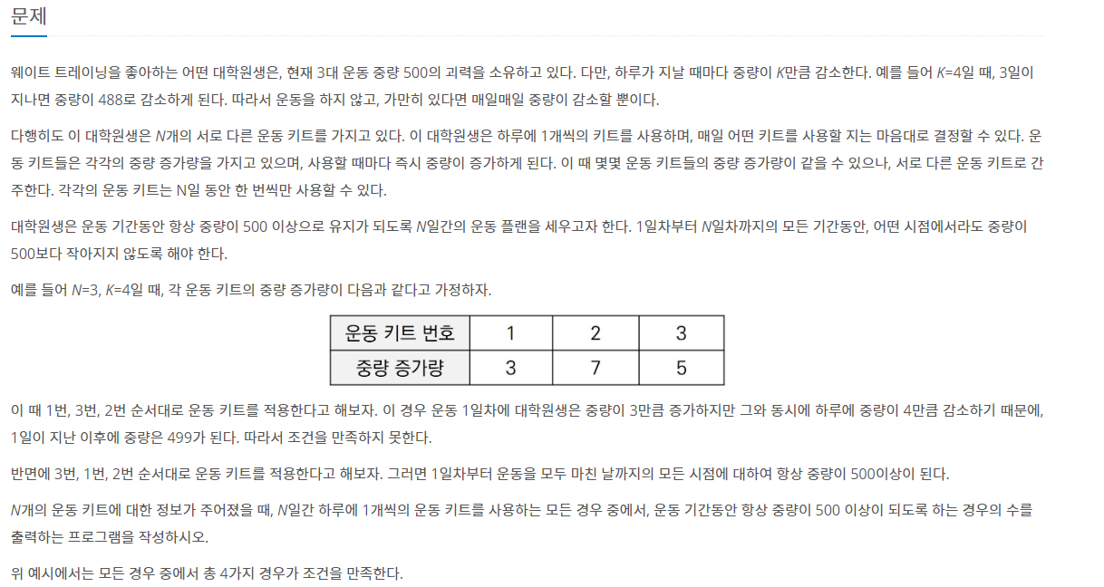 운동키트의 중량이 같다고 하더라도 이를 모두 다르게 보기 때문에 모든 경우의 수를 탐색해야하는 순열로 생각하여 풀었습니다. 가능한 경우를 생성하고 이때 N일동안 근육량이 500이상이 되는지 체크한뒤 가능한 경우의 수를 카운트하였습니다.
