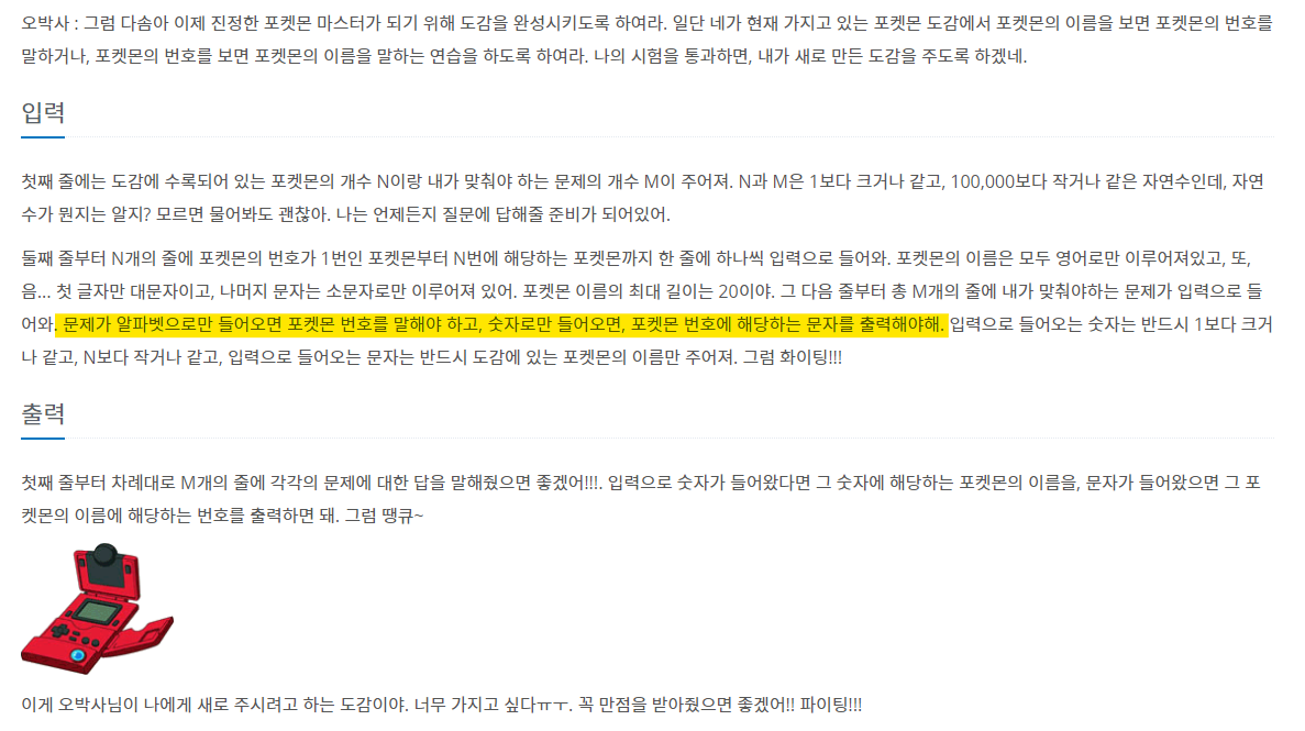 1번부터 N번까지의 포켓몬의 이름을 입력으로 받고 M개의 포켓몬의 정보를 통해 해당 포켓몬의 이름이나 번호를 출력하는게 문제입니다. N과 M이 100000이하의 자연수이고 포켓몬의 이름이 최대 20이기 때문에 일반적인 반복문을 통해 포켓몬의 정보를 찾으려면 N*M*20 대략 2천억번의 연산이 필요합니다.