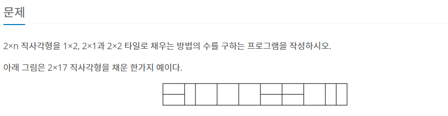2×n 직사각형을 1×2, 2×1과 2×2 타일로 채우는 방법의 수를 구하는 프로그램을 작성하시오. 아래 그림은 2×17 직사각형을 채운 한가지 예이다.